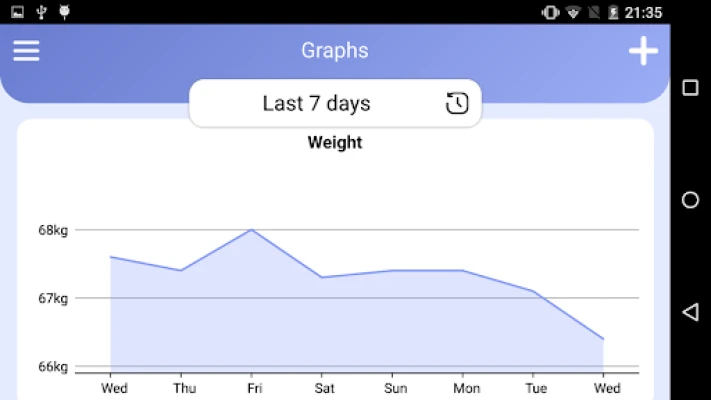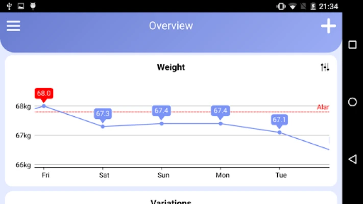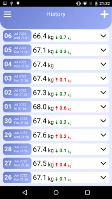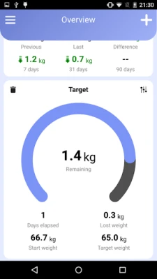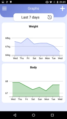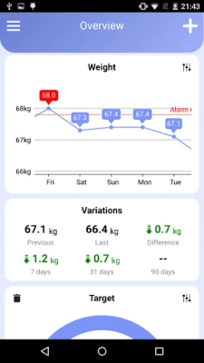 The app allows you to keep track of your daily weight. Associated with the weight you can freely add other parameters you want such as numbers, text, photos, etc. Through the graphs and data you can understand the trend of your weight over time. The history allows you to view the progress and information saved daily. You can also set warning lines or colored areas in the the graph to show a visual warning when the weight is in some critical value. Also a target weight can be set showing the information about the progress. All data can be backuped and exported in Excel format.