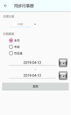 使用者可透過查詢介面,確認行事曆下載的範圍後,將選擇範圍的行事曆資訊從 GD-CRM 主機下載到行動裝置。若有重複會顯示相關的提示訊息。