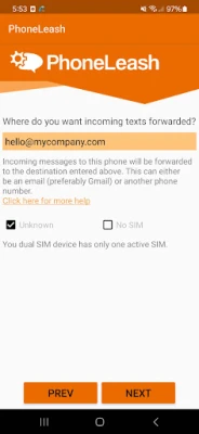 3. Enter the email address you want to forward incoming texts to. PhoneLeash works really well with Gmail.